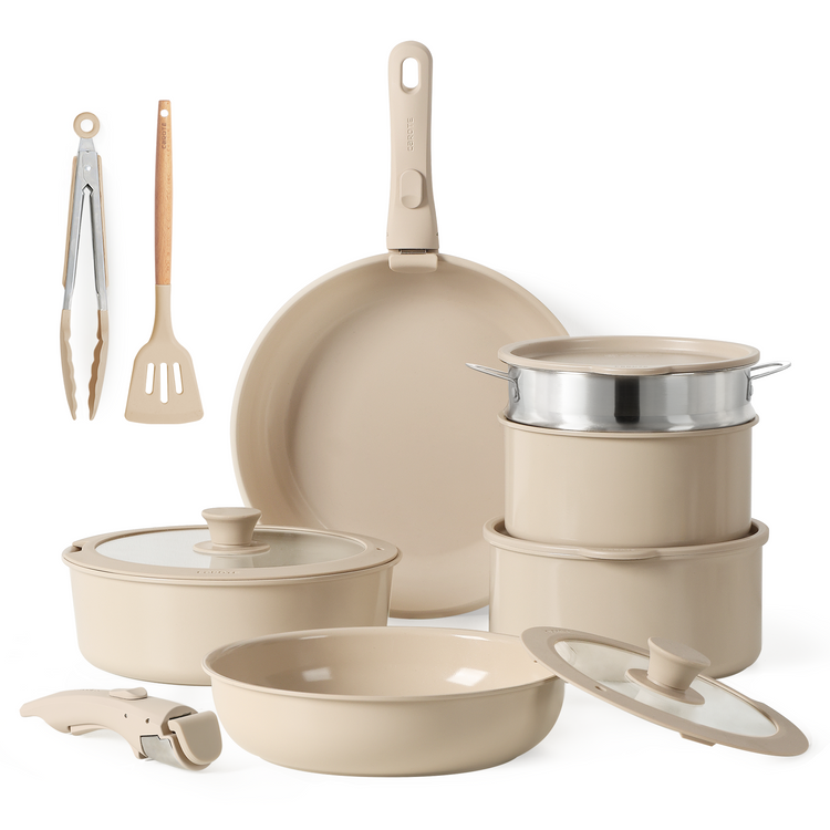 14pcs Pots and Pans Set, Ceramic Cookware Set Detachable Handle, Taupe