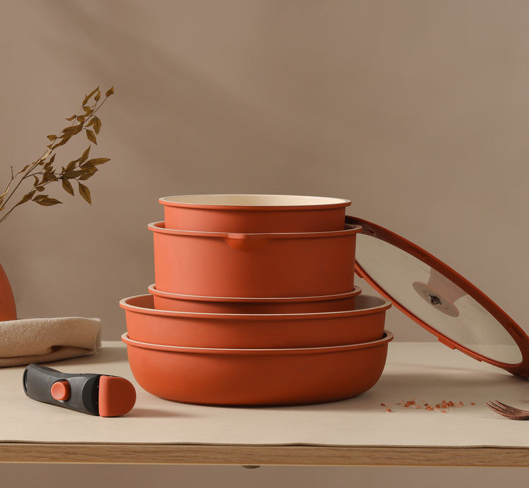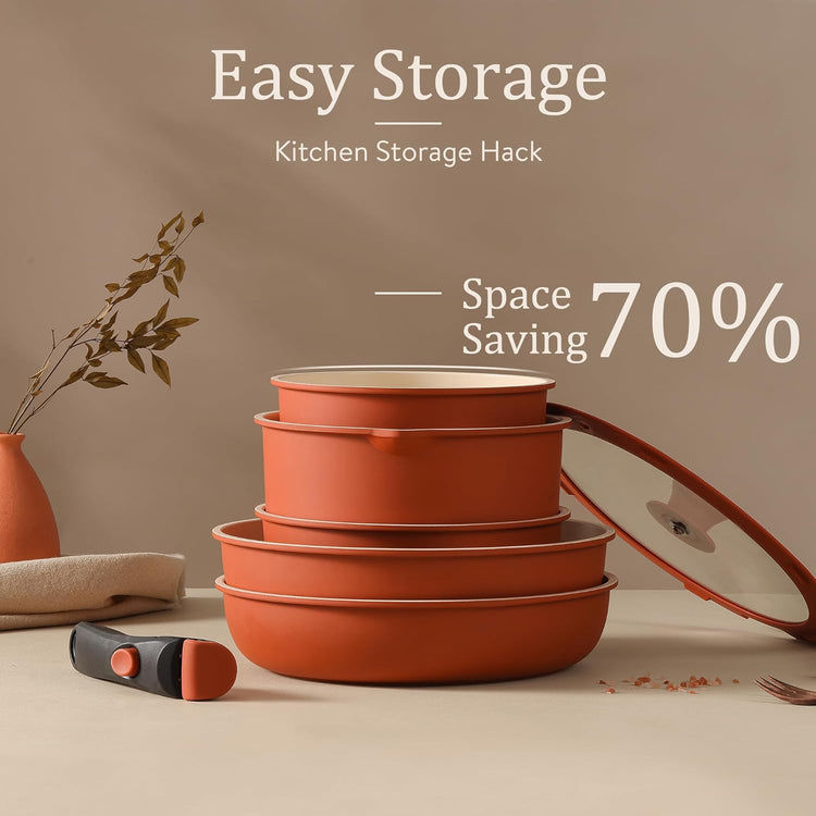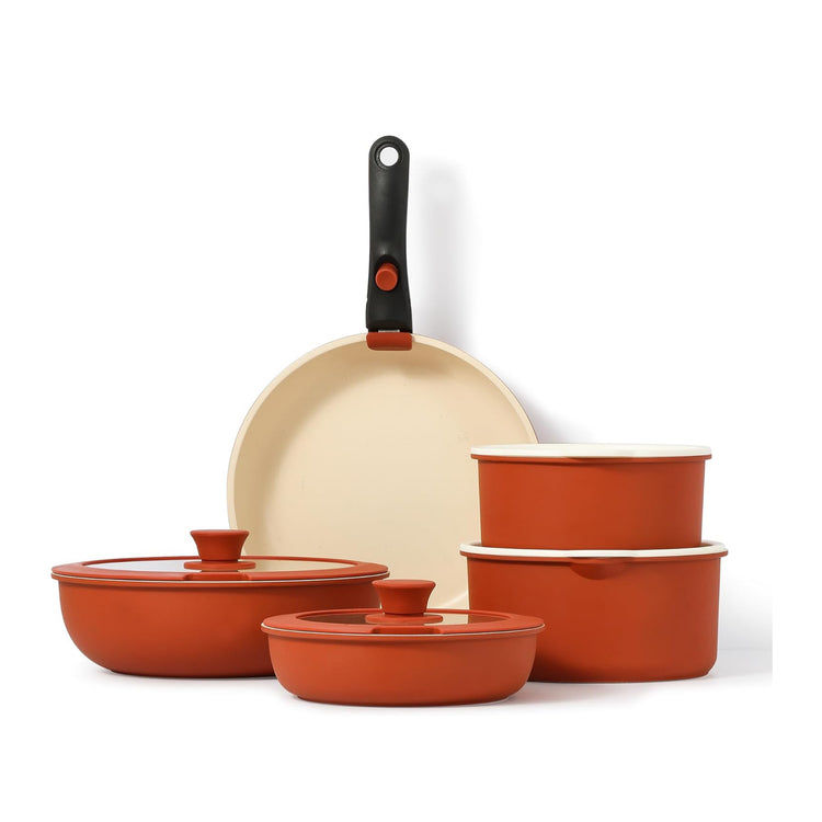 10-Piece Nonstick Cookware Set with Detachable Handles - Elegant Red