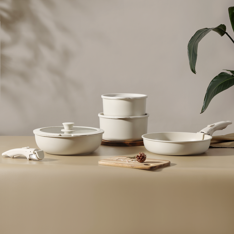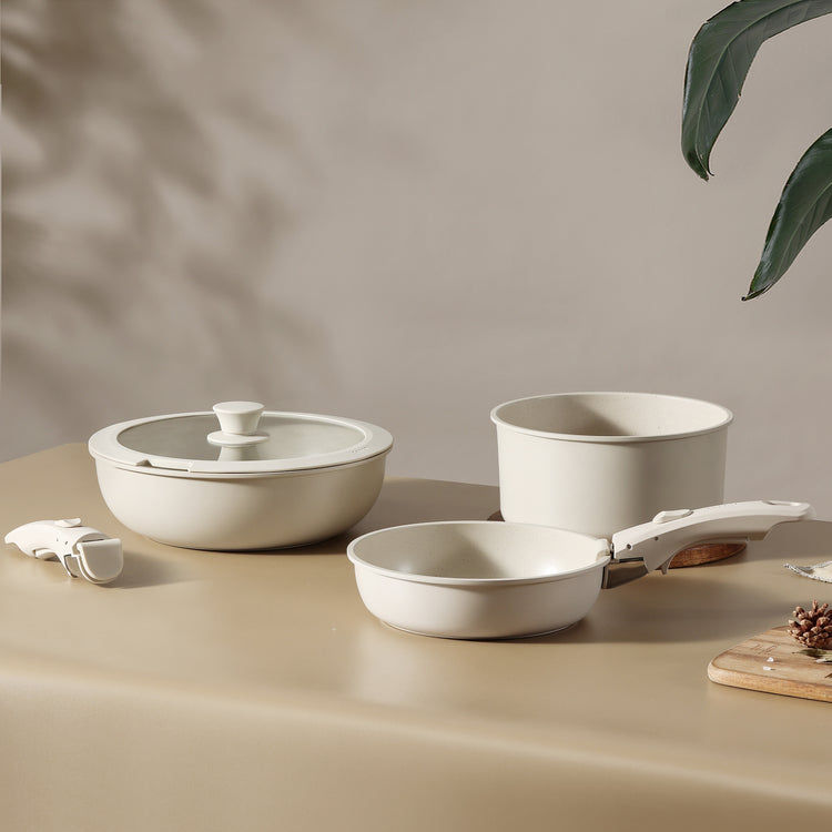 Induction Kitchen Cookware Sets Non Stick with Removable Handle, RV Cookware Set, Oven Safe, Greige Beige
